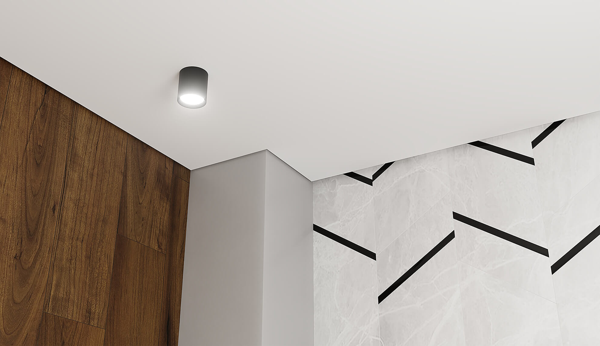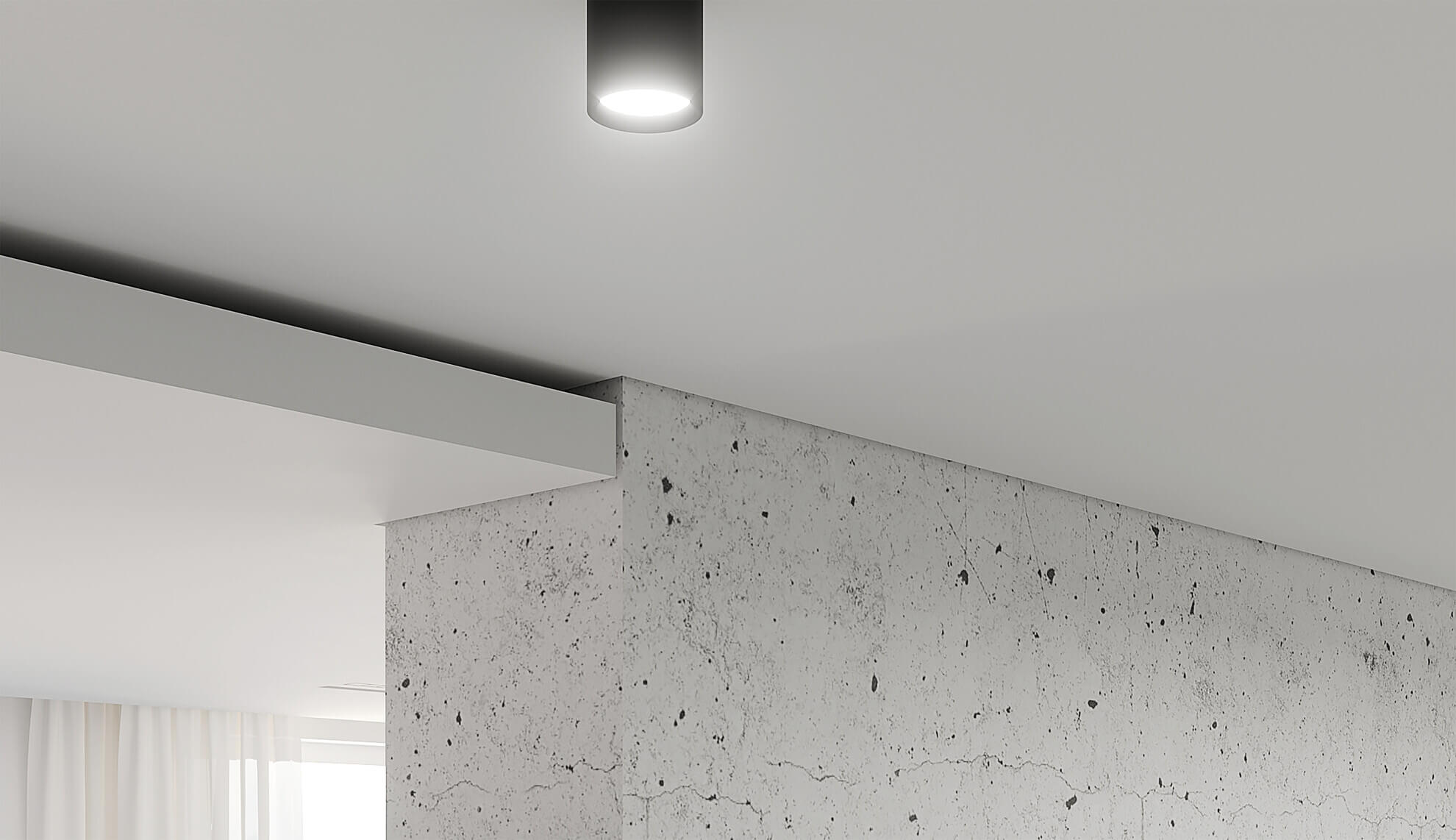 Позволяет создать потолки с уникальным дизайном и эстетикой, благодаря теневому зазору и идеальному сопряжению цветов потолка и стен. Теневой шов хорошо смотрится как на ровных поверхностях стен, так и на плитке, декоративном кирпиче, 3D панелях и других материалах, образующих не ровную поверхность стен. Идеальное сопряжение контрастных цветов получается за счёт отступа краёв потолка от стен, вследствие чего отпадает необходимость проведения малярных работ в области примыкания потолка к стенам.