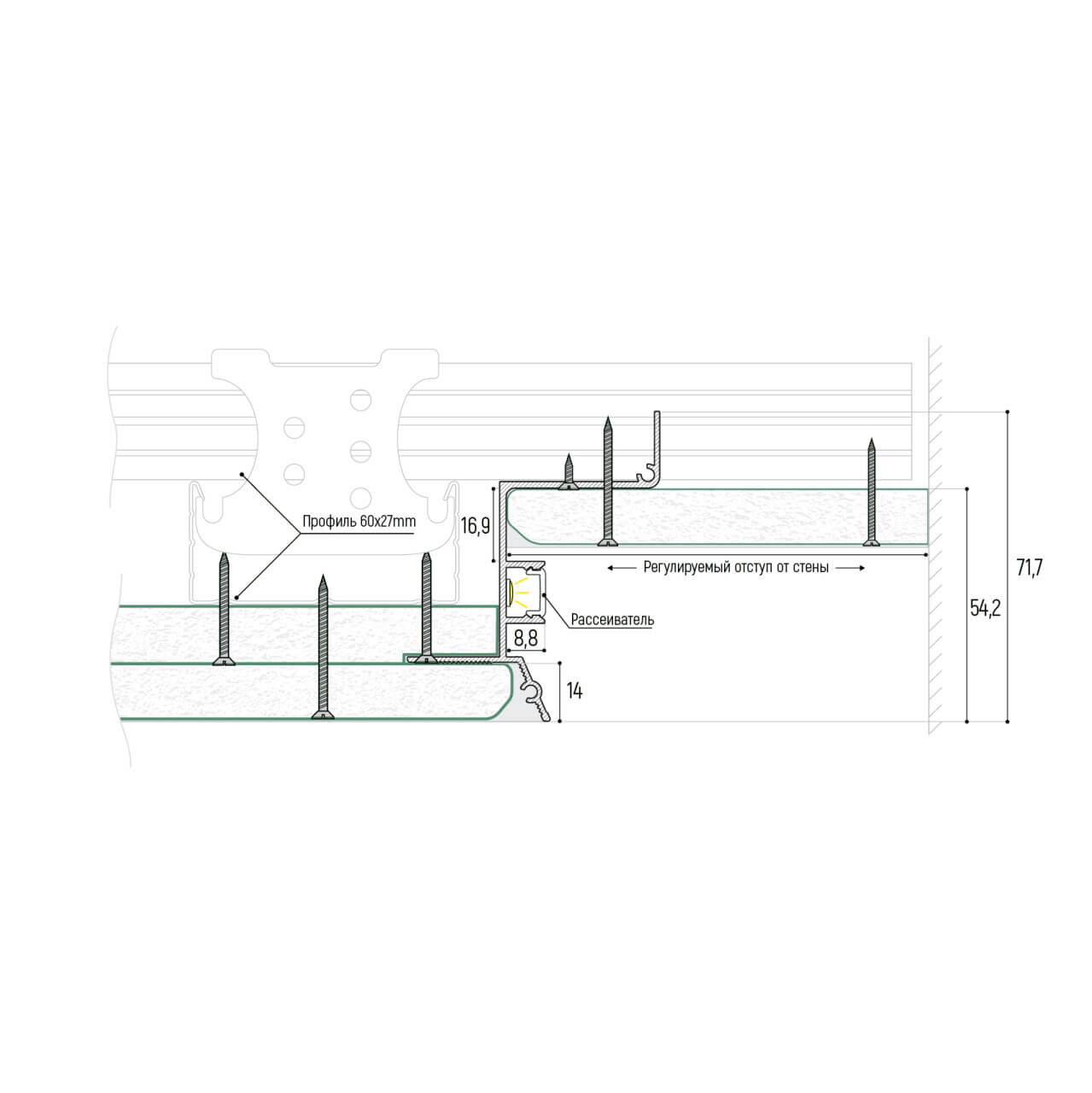 Профиль используется для создания эффекта “парящего в воздухе” потолка, потолок крепится с отступом от стен. Место крепления конструкции незаметно, по всему периметру потолок подсвечивается мягким светом.