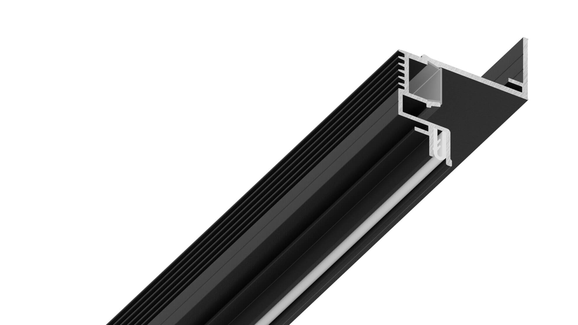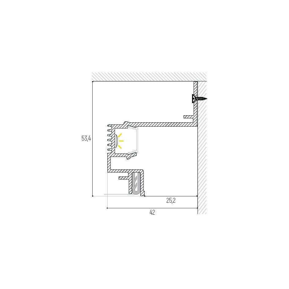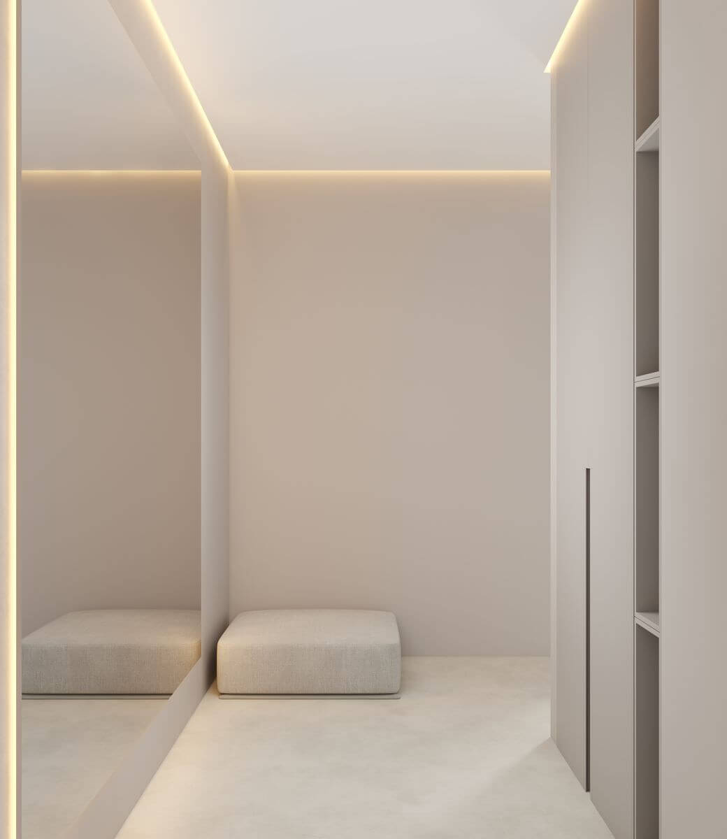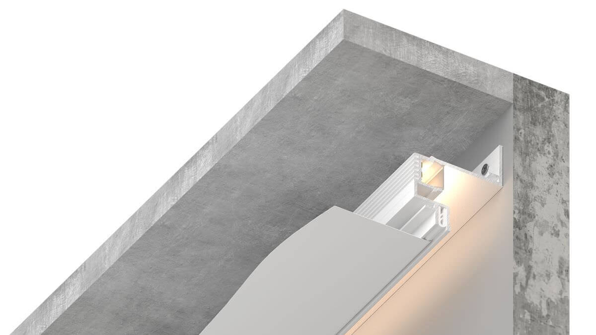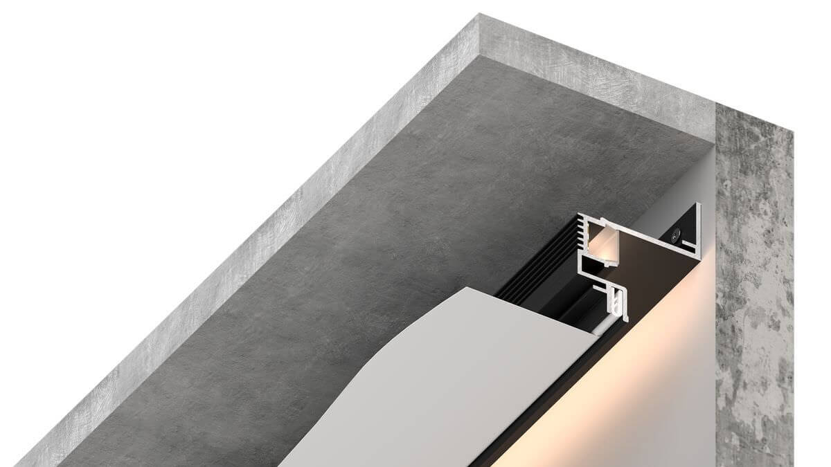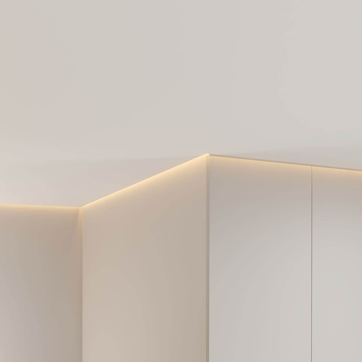 Самонесущая конструкция парящего профиля с фиксированным отступом от стены и мягкой подсветкой, не подчёркивающей неровности стены.
