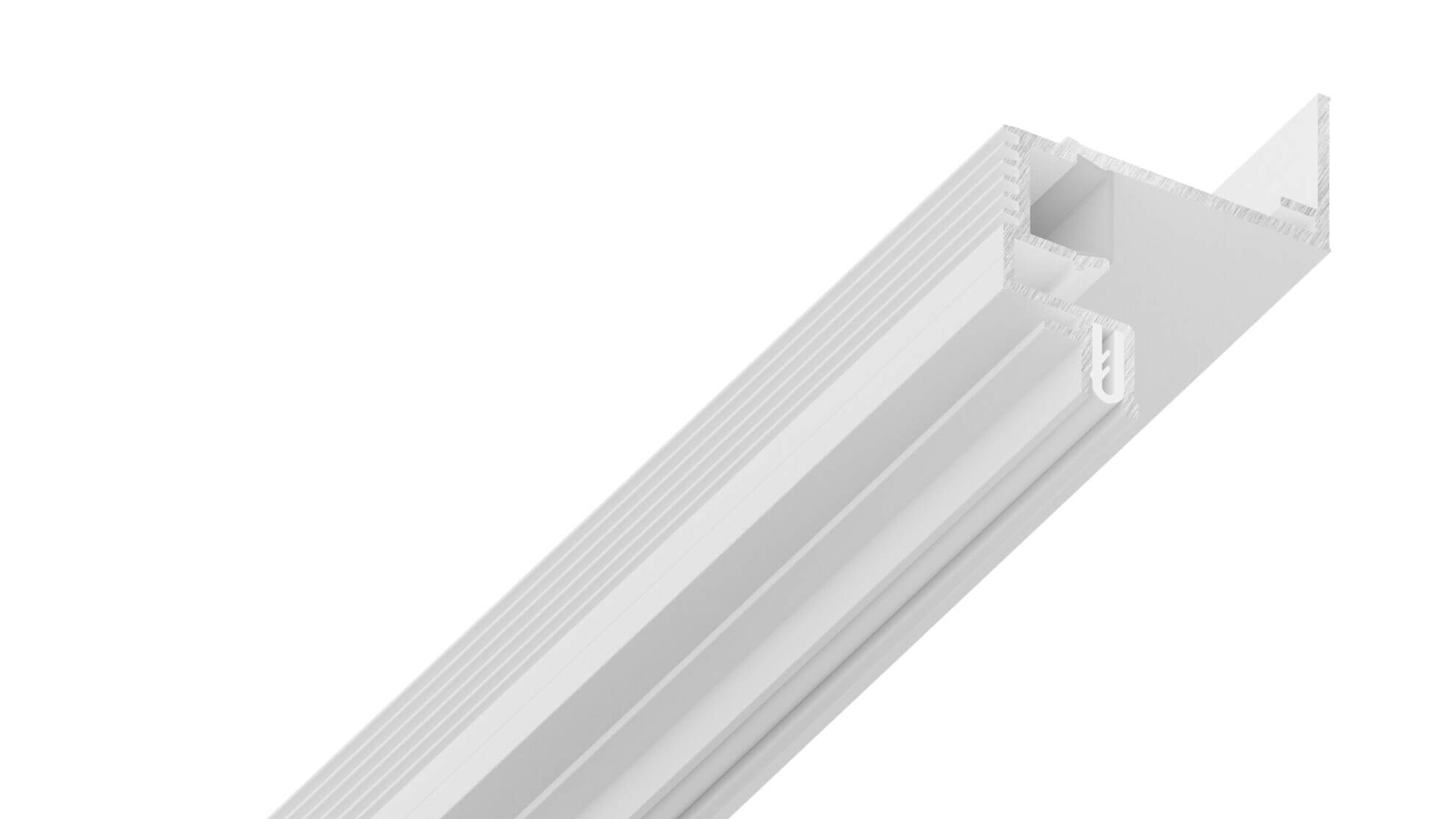 Самонесущая конструкция парящего профиля с фиксированным отступом от стены и мягкой подсветкой, не подчёркивающей неровности стены.