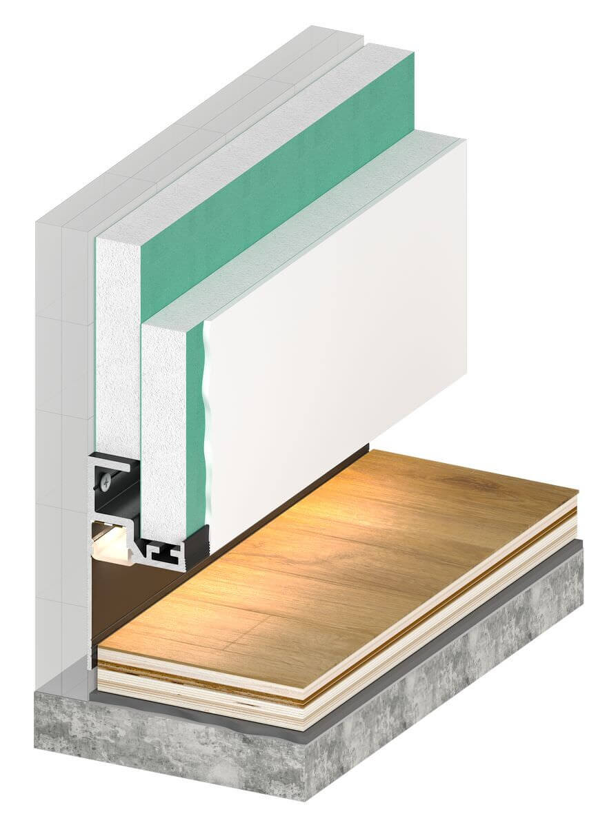 Технология теневого плинтуса KRAAB GIPPS предотвращает появление линейных расширений, формирует ровный зазор и идеальное теневое примыкание. Металлический внешний угол предотвращает различные сколы и деформации стены или штукатурки.