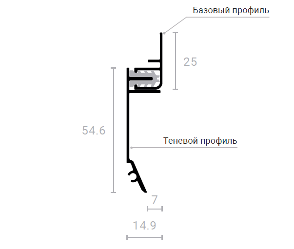 По периметру стены монтируется базовый профиль UMBRA — это основной элемент. Далее, с помощью демпферного соединения, мы можем установить любую другую часть системы — от теневого профиля до системы вентиляции с КСД.