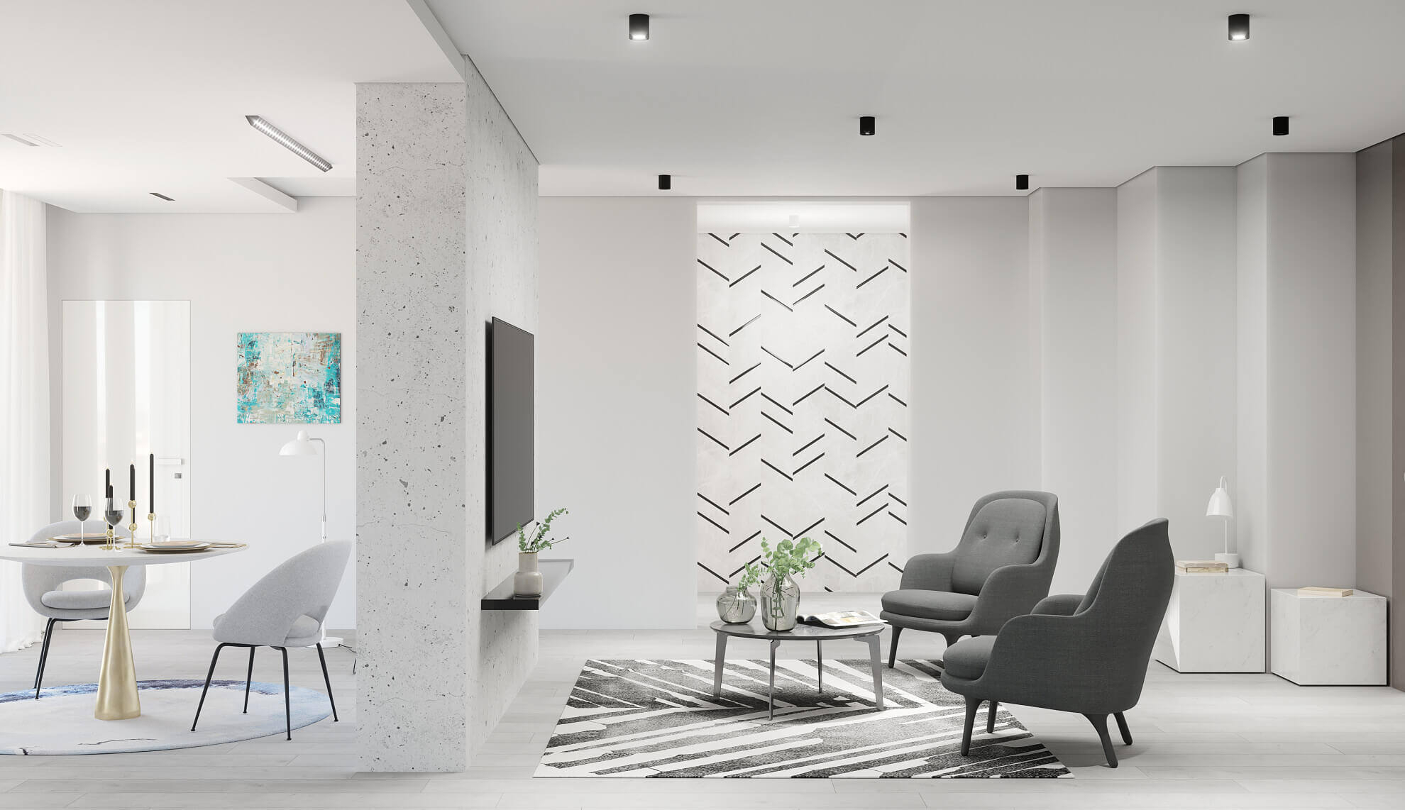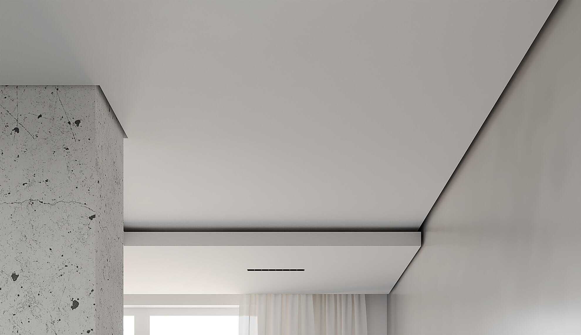 Позволяет создать потолки с уникальным дизайном и эстетикой, благодаря теневому зазору и идеальному сопряжению цветов потолка и стен. Теневой шов хорошо смотрится как на ровных поверхностях стен, так и на плитке, декоративном кирпиче, 3D панелях и других материалах, образующих не ровную поверхность стен. Идеальное сопряжение контрастных цветов получается за счёт отступа краёв потолка от стен, вследствие чего отпадает необходимость проведения малярных работ в области примыкания потолка к стенам.