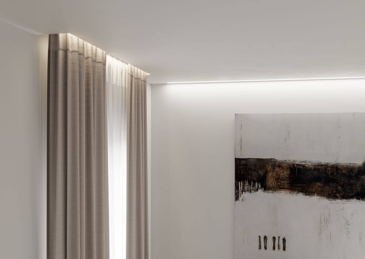 Гардинный профиль обладает скрытой системой освещения, оснащен встроенным рассеивателем. Система разработана таким образом, чтобы свет падал строго вниз по шторе. Встроенное освещение является декоративным. Карнизный профиль не комплектуется светодиодной лентой, она приобретается отдельно исходя из поставленных задач (цветовая температура, мощность, напряжение и т.д). Если дополнительное освещение не требуется, ленту можно не устанавливать.