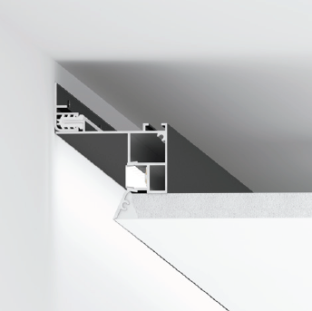 Периметральные профили для организации декоративного зазора с подсветкой. Классический парящий с нерегулируемым зазором в 30 мм крепится на базовый демпферный профиль.