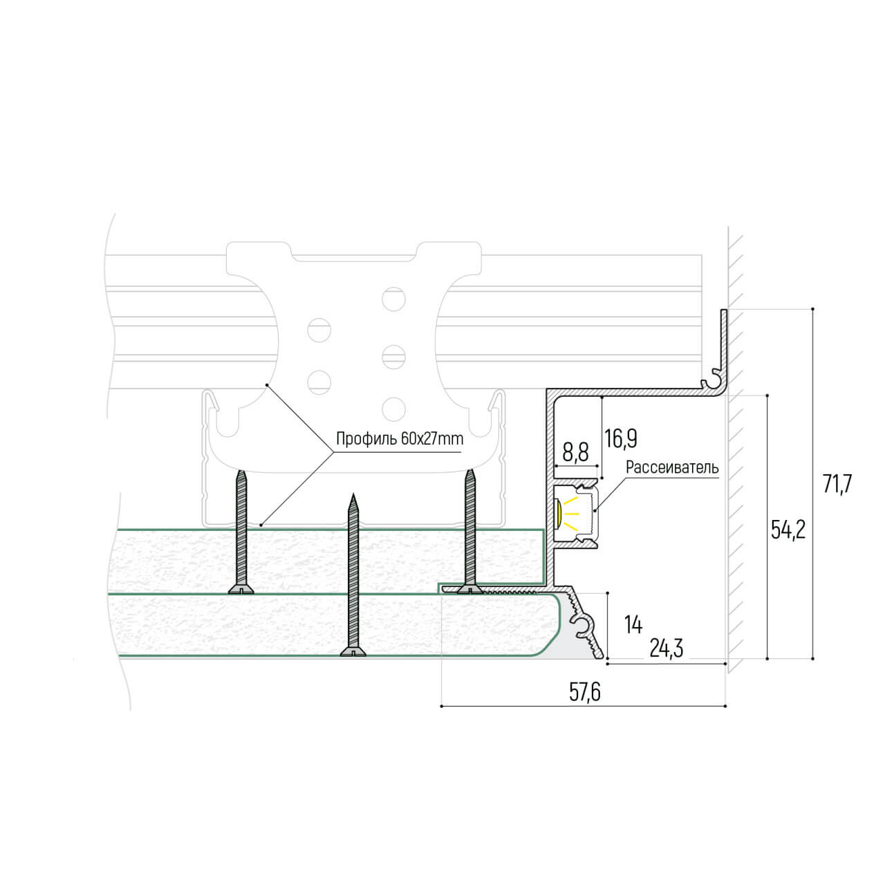 Профиль используется для создания эффекта “парящего в воздухе” потолка, потолок крепится с отступом от стен. Место крепления конструкции незаметно, по всему периметру потолок подсвечивается мягким светом.