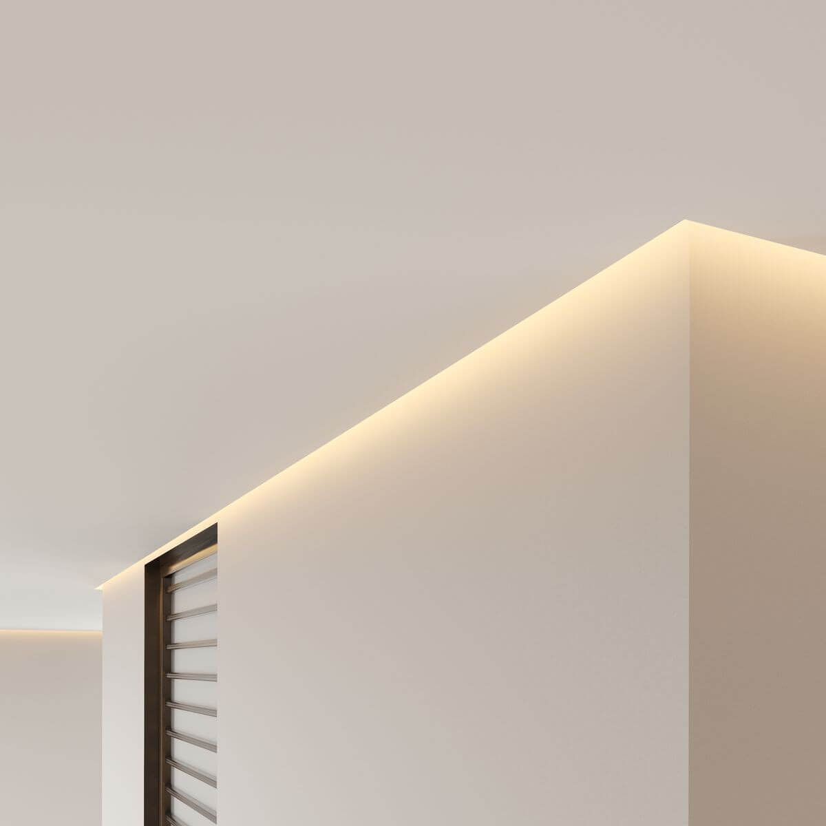 Самонесущая конструкция парящего профиля с фиксированным отступом от стены и мягкой подсветкой, не подчёркивающей неровности стены.