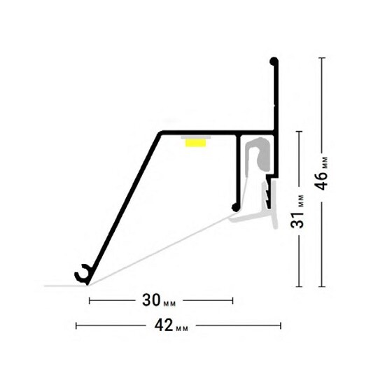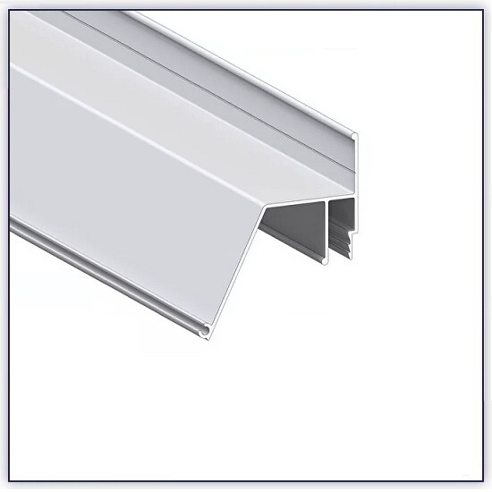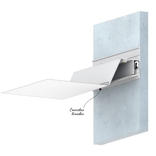 Стеновой контурный профиль ПФ 6488 для натяжных потолков с гарпунной системой крепления полотна. С полкой для светодиодной ленты для подсветки через полотно, направленной в сторону. По периметру профиль закрывается стеновой вставкой.