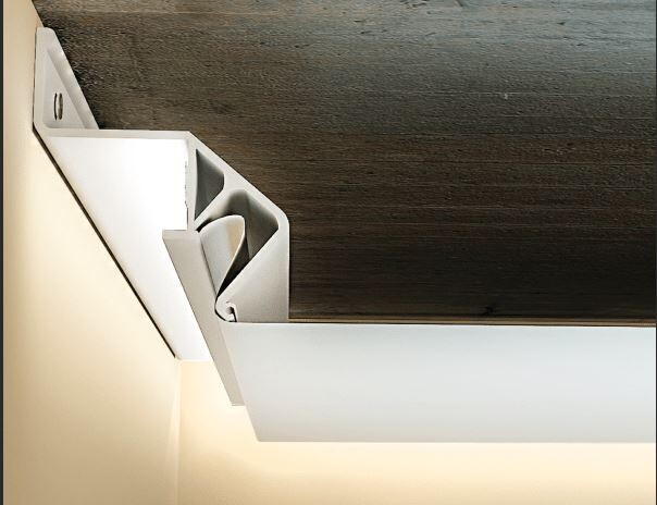 Стеновой парящий профиль Flexy FLY 01 для натяжных потолков с гарпунной системой крепления полотна. С полкой для светодиодной ленты. Без светорассеивающей вставки.