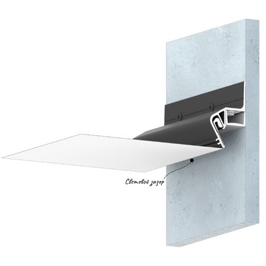 Конструкция профиля, сделана так что основная часть находится на нескольких сантиметров от стены. В профиле содержится паз для размещения скрытой подсветки. Элементы освещения не видны, свет направлен так, что возникает эффект свободно парящей поверхности.