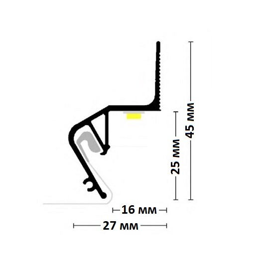 Стеновой парящий профиль ПФ 8406 для натяжных потолков с гарпунной системой крепления полотна. С полкой для светодиодной ленты и креплением для светорассеивающей вставки.