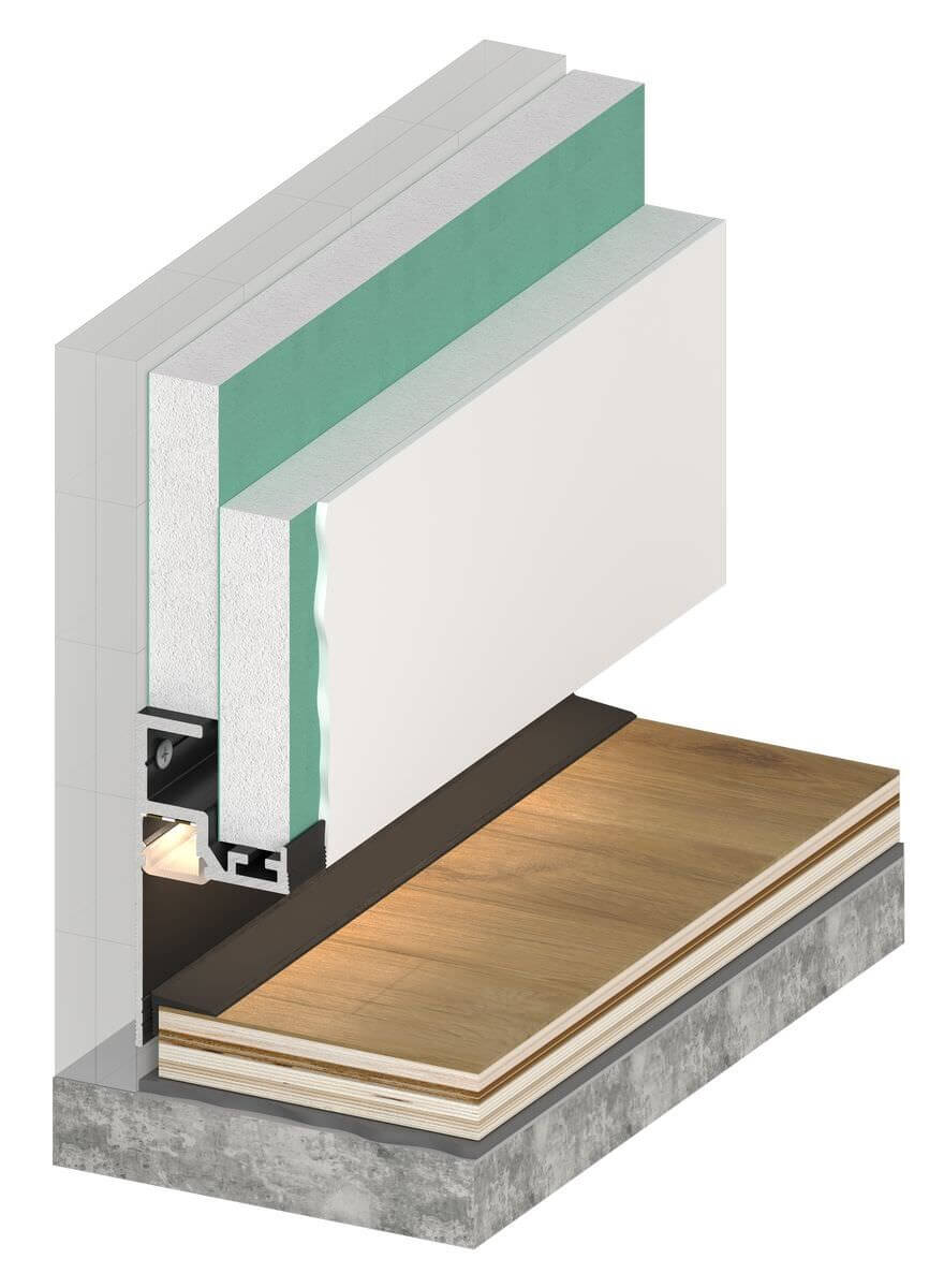 Технология теневого плинтуса KRAAB GIPPS предотвращает появление линейных расширений, формирует ровный зазор и идеальное теневое примыкание. Металлический внешний угол предотвращает различные сколы и деформации стены или штукатурки.